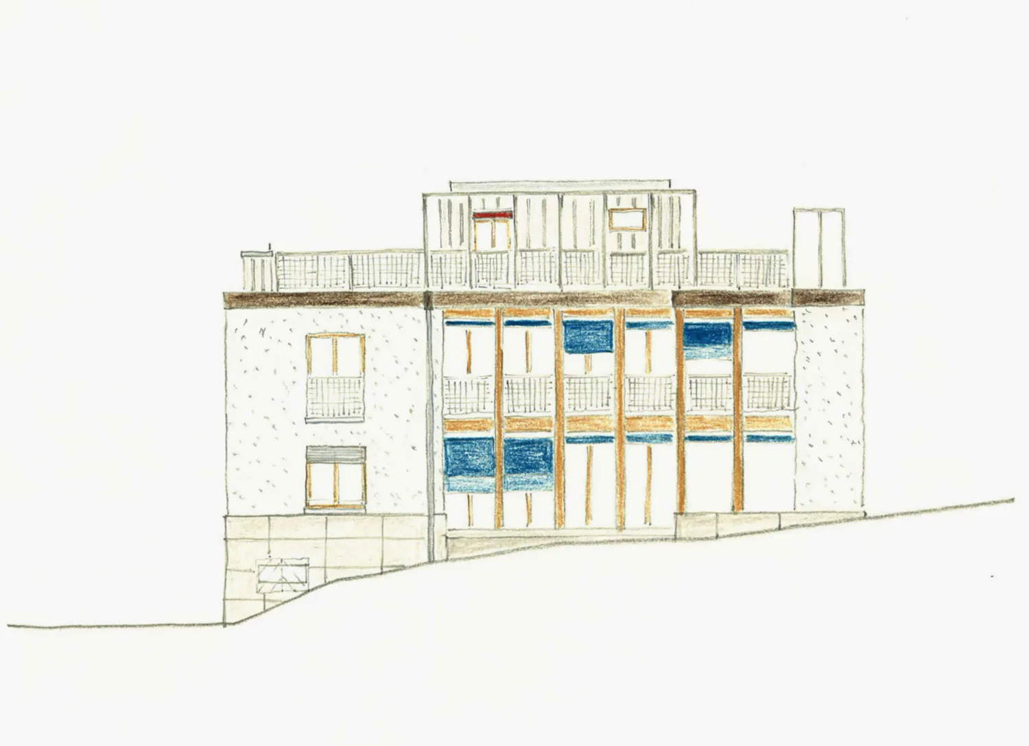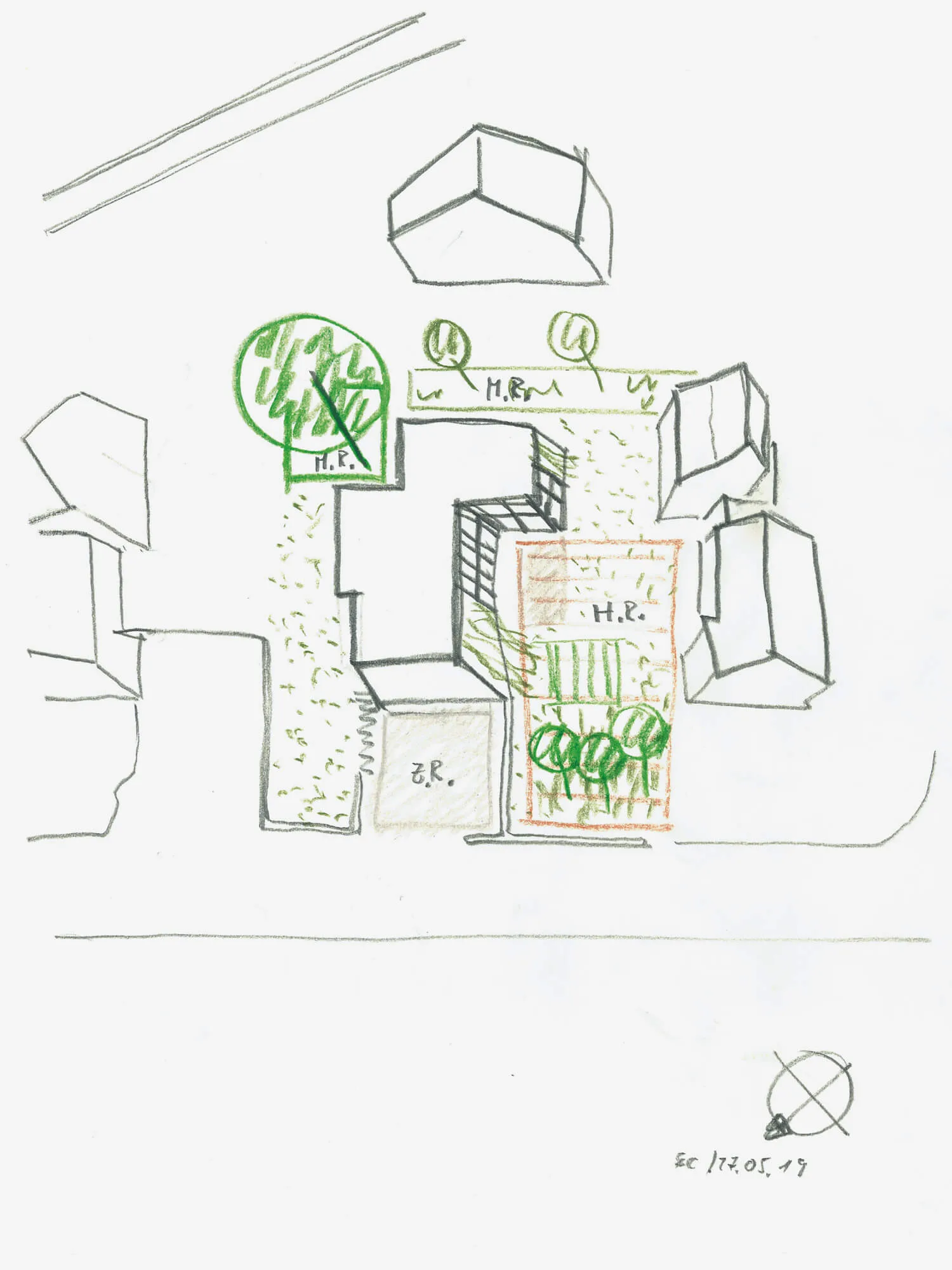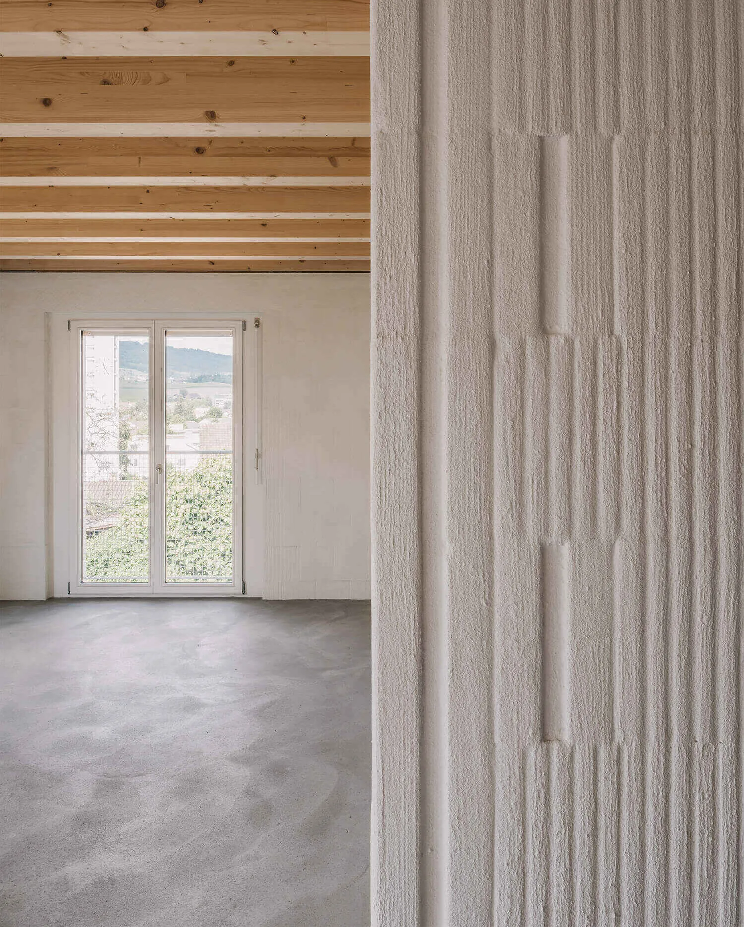 The designed figure is oriented towards the landscape in the southwest, which allows a wide view of the valley and the mountain ranges. Various outdoor spaces with different recreational qualities define the volume with its projections and recesses. The place between the new house and the parental home next door forms the main outdoor space. A large, multifunctional square mediates between the street and the house. The flats on each floor have a classic layout.