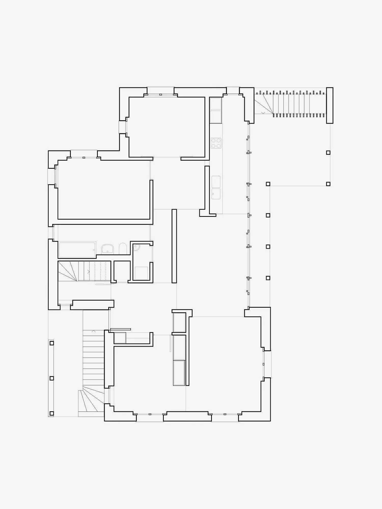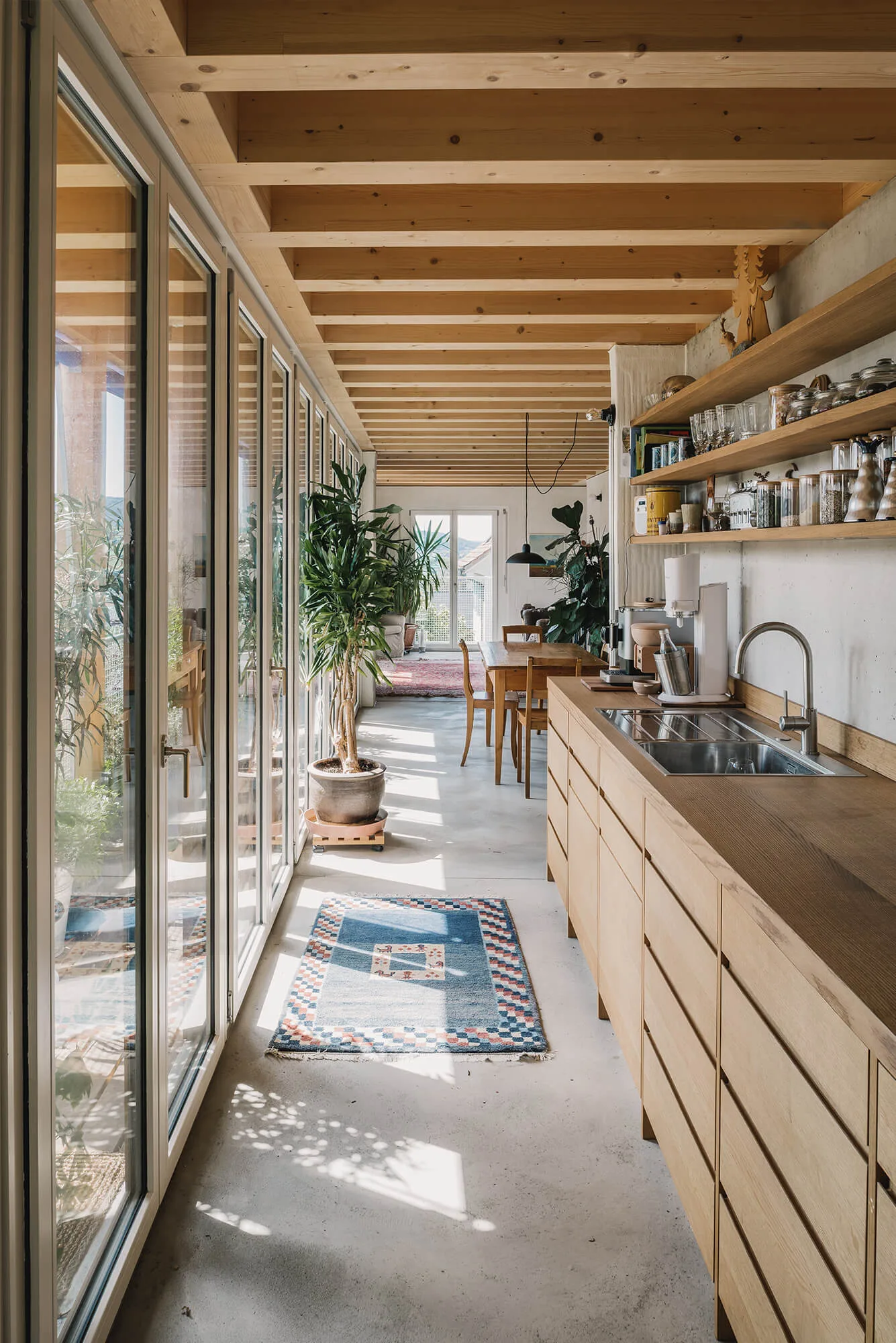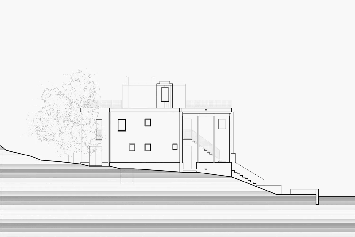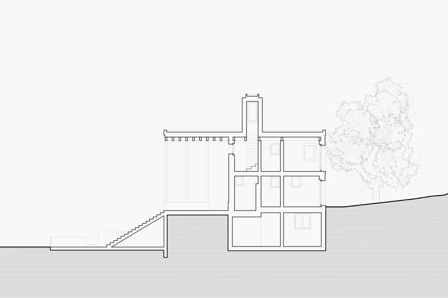 A layer of rooms with the bedrooms and bathrooms provides a back to the northeast. The living rooms nestle along the sun façade and, together with the veranda, form the main living area. The rooms and layers are interconnected by views that function as visual axes through the house into the landscape. Despite the minimal use of surface area, generosity can be created in this way. The house consists of a concrete base anchored into the slope, which together with a traditionally rendered single-stone masonry and a copper finish forms the main body. The exterior spaces as well as the roof with its attic room are built in wood. In terms of expression and construction, the house is inspired by bourgeois suburban houses as well as rural settlements in the Zurich area.